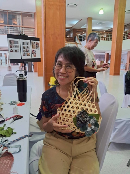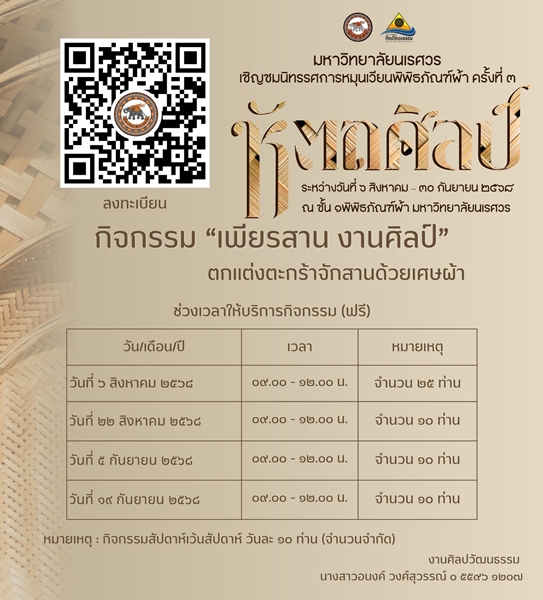 ภาพบรรยากาศกิจกรรม Workshop “D.I.Y. เพียรสาน งานศิลป์” ด้วยการตกแต่งตะกร้าจักสานเพื่อใส่ของฝาก โดยการนำเศษผ้าที่ไม่ใช้ สร้างสรรค์ ตกแต่งเป็นลวดลายบนชิ้นงานจักสานสามารถสร้างอาชีพ และสร้างรายได้ให้แก่ผู้ที่สนใจ Workshop ครั้งที่ 3 วันที่ 5 กันยายน 2568 (เต็ม) Workshop ครั้งที่ 4 วันที่ 19 กันยายน 2568 ตั้งแต่เวลา 09.00 – 12.00 น. ณ อาคารพิพิธภัณฑ์ผ้า มหาวิทยาลัยนเรศวร ลงทะเบียนเข้าร่วมกิจกรรม : https://forms.gle/j3MmQ7SfwTNk9Zpp6 ติดต่อสอบถาม 0 5596 1207 คุณอนงค์ วงศ์สุวรรณ์ Webpage: กองส่งเสริมศิลปวัฒนธรรม มหาวิทยาลัยนเรศวร Webpage: พิพิธภัณฑ์ผ้า มหาวิทยาลัยนเรศวร Textile Museum