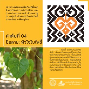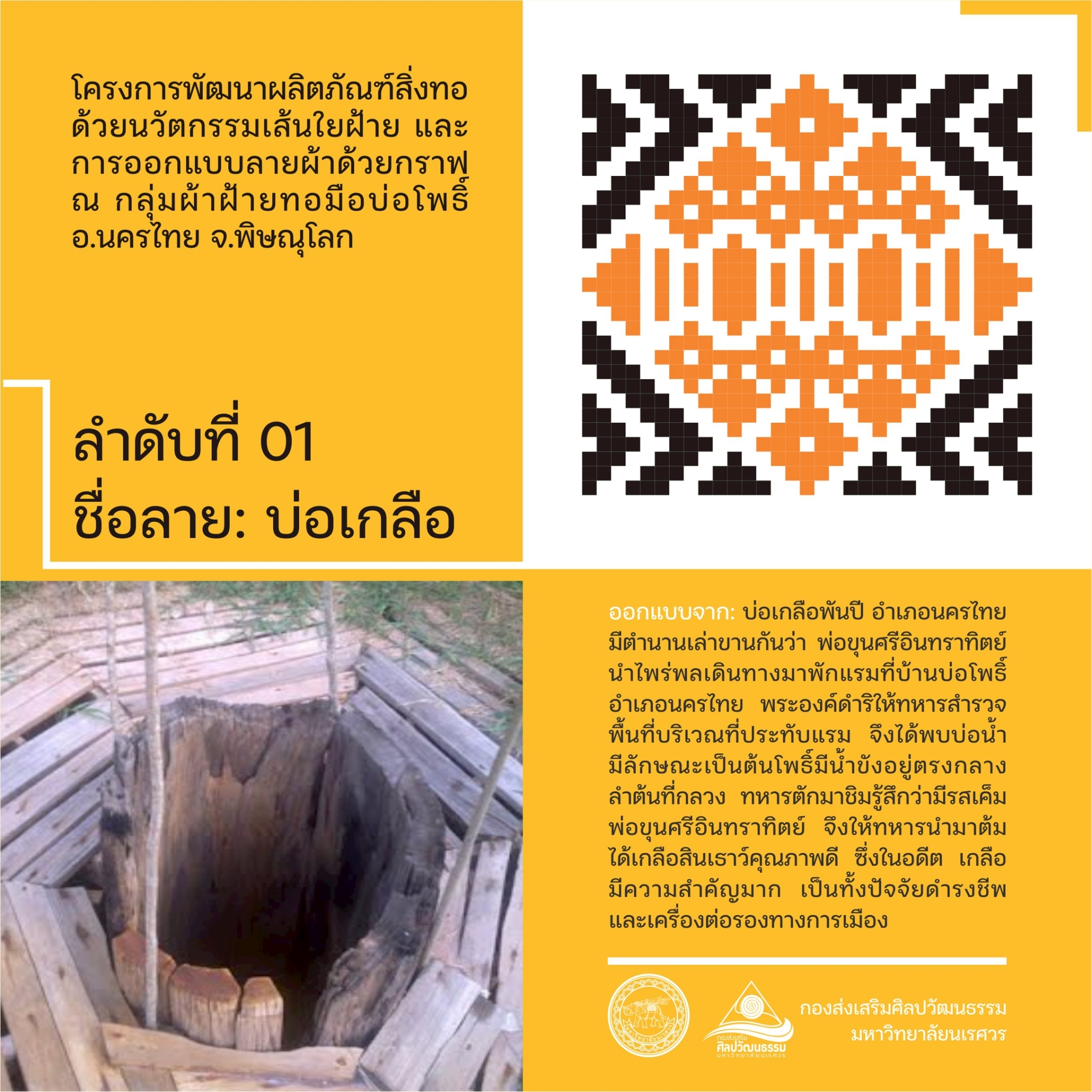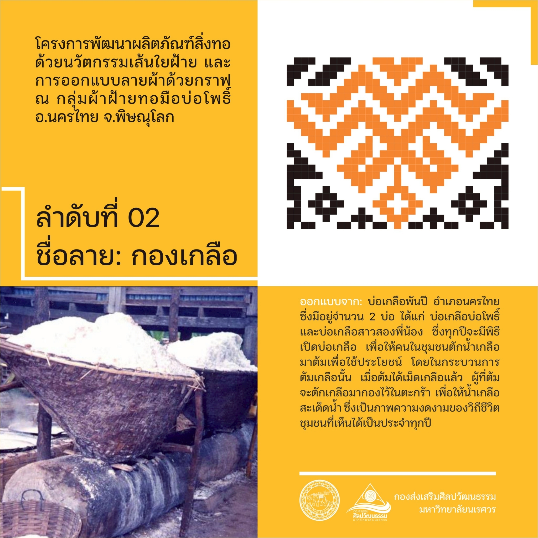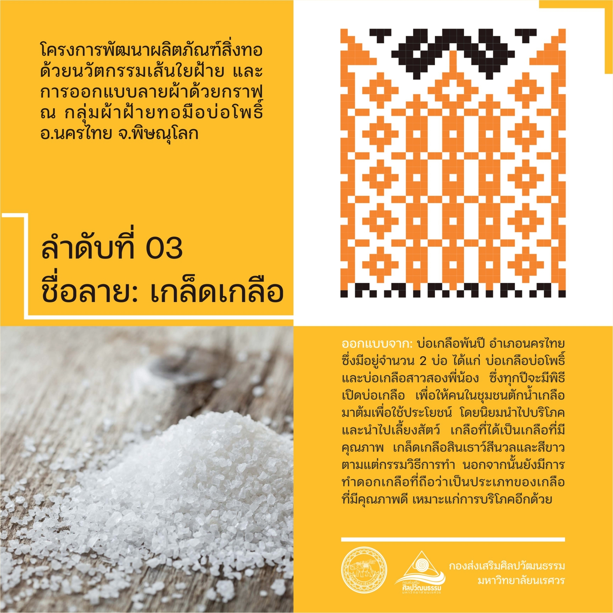 ประกอบด้วย ลายบ่อเกลือ ลายกองเกลือ ลายเกล็ดเกลือ ลายหัวใจใบโพธิ์ และลายดอกแดง