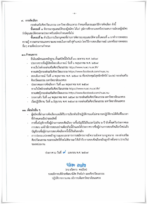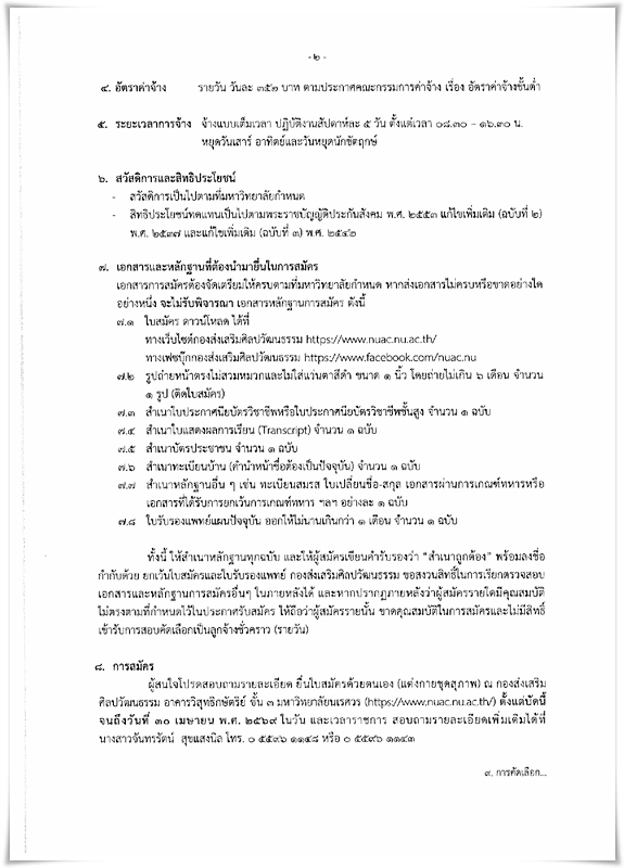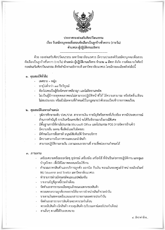 มหาวิทยาลัยนเรศวร เปิดรับสมัครบุคคลเพื่อสอบคัดเลือกเป็นลูกจ้างชั่วคราว (รายวัน) จำนวน 1 อัตรา สังกัดงานพัฒนานวัตศิลป์ กองส่งเสริมศิลปวัฒนธรรม สำนักงานอธิการบดี มหาวิทยาลัยนเรศวร รายละเอียดดังต่อไปนี้